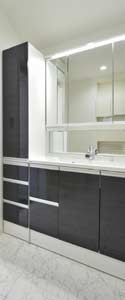 三面鏡のミラーキャビネットになっています。カウンターボウルは一体成形ですので汚れにくく、そしてお掃除が簡単。いつもキレイを保てます。ライフハウジングでは、洗面化粧スペースをできる限りのスペースを確保し、収納機能を高めるように工夫しています。