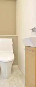 一体型シャワートイレ(エコタイプ)を採用しています。従来のものと比較しますと、70%前後の節水、水道料金として13,800円~14,200円おトク。便器はフチなしでお手入れも簡単。また、ルーム内の収納には手洗いキャビネットを採用しています。
