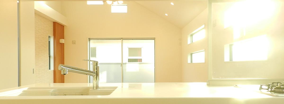 LED照明で明るさをまとめています。リビングには天井高に合わせてのシーリングファンライトなどを標準採用することもあります。玄関廊下、キッチン、洗面脱衣室、トイレは、統一してダウンライトを使うことでスッキリとした空間設計を実現しています。